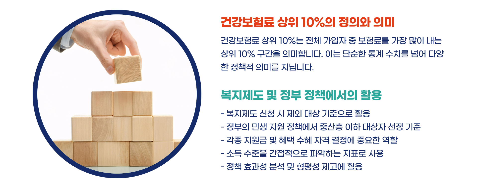 '건강보험료 상위 10%'는 전체 가입자 중 보험료를 많이 내는 상위 10% 구간을 말합니다. 주로 복지제도 신청 시 제외 대상이 되는 기준으로 활용되며, 정부의 민생 지원 정책에서 중산층 이하 대상자 선정 기준으로도 자주 사용됩니다.