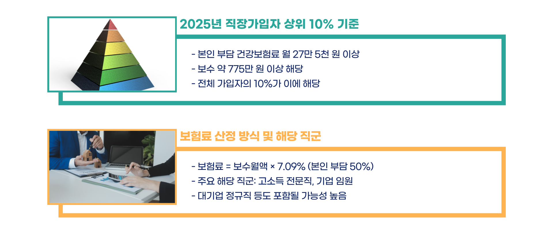 2025년 기준, 직장가입자 본인 부담 건강보험료가 월 27만 5천 원 이상이면 상위 10%로 추정됩니다.