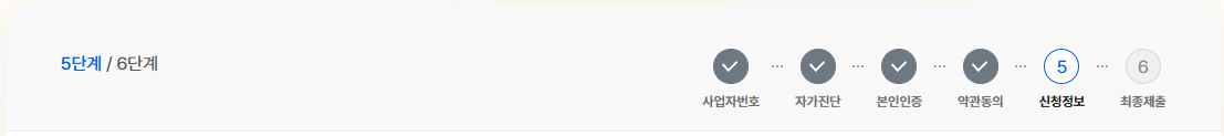 - 자가진단 → 본인인증 → 약관동의 → 신청정보 입력 → 최종제출
