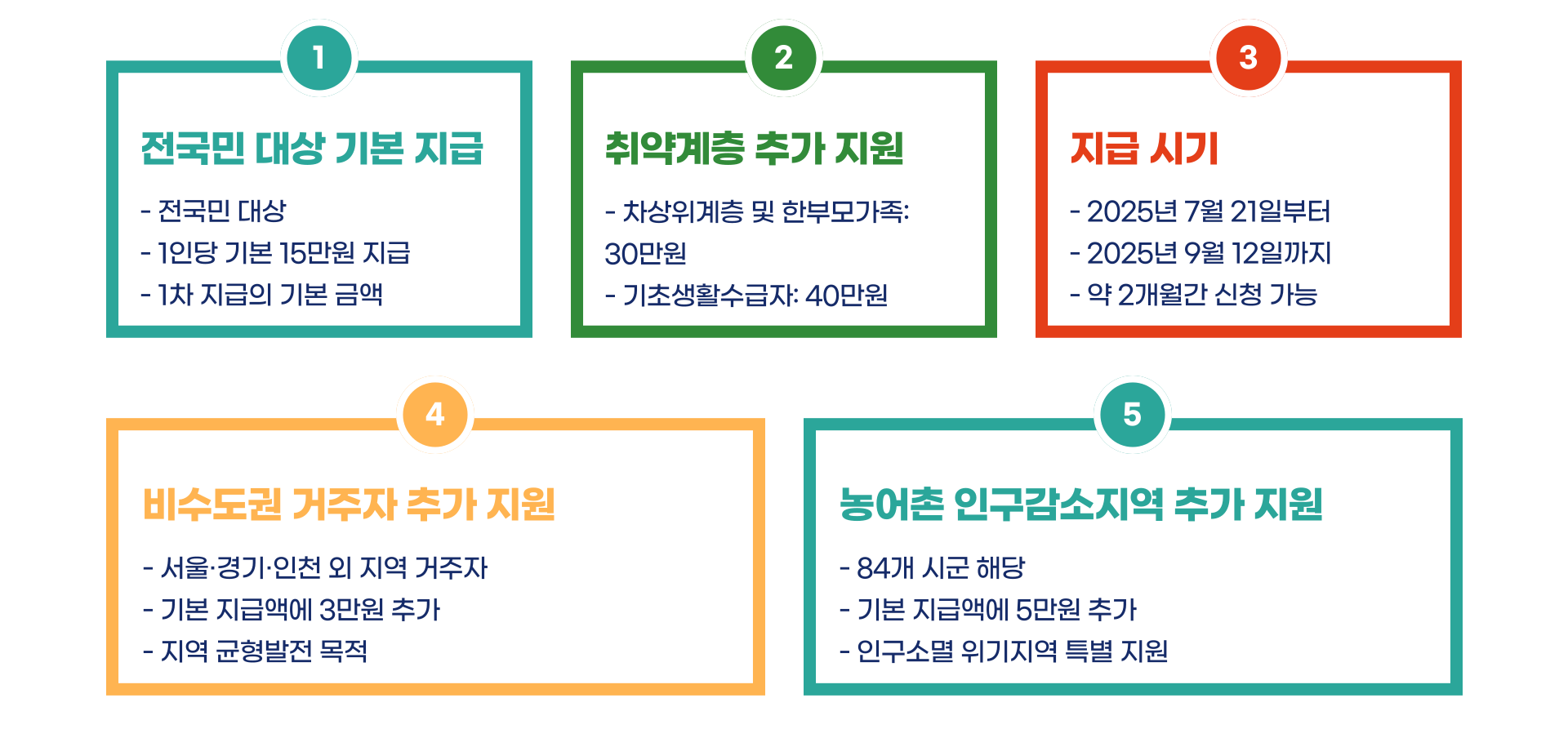 정책에 따르면 2025년 7월 21일~9월 12일 동안 전국민에게 기본 1인당 15만 원이 지급되었습니다. 다만, 차상위계층 및 한부모가족은 30만 원, 기초생활수급자는 40만 원 지급되었습니다. 이에 비수도권 거주자에게는 지역별로 +3만 원, 농어촌 인구감소지역 주민에게는 +5만 원 추가 지급도 이루어졌습니다.