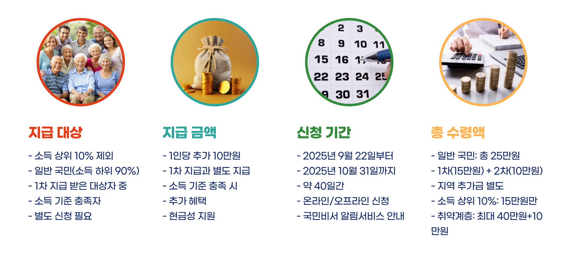 2025년 9월 22일~10월 31일 사이에 시행된 2차 지급은 소득 상위 10%를 제외한 국민에게 1인당 추가 10만 원을 지급하는 방식입니다. 즉, 일반 국민(소득 하위 90%)은 1차 15만 원 + 2차 10만 원을 모두 받고, 총 25만 원을 수령하게 됩니다.
