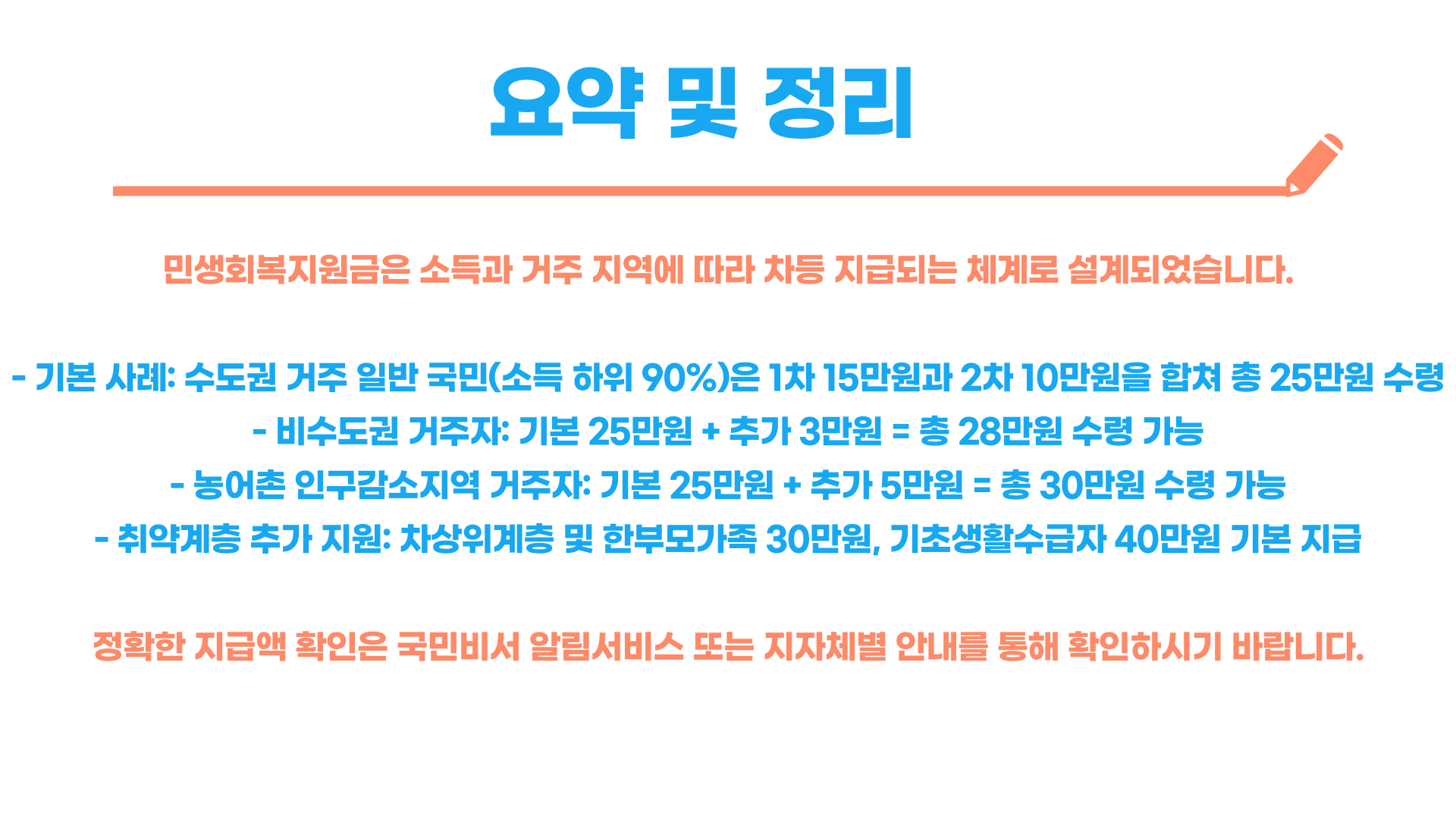 “민생회복지원금 25만 원”은 1차 기본 15만 원 + 2차 추가 10만 원을 모두 받은 경우에 해당합니다. 이 조건은 소득 상위 10%가 아니며, 정상 신청 및 지급을 받은 일반 국민에게 해당되며, 특히 수도권 거주자의 경우 기본적인 사례입니다. 단, 비수도권 또는 농어촌 인구감소지역 거주자는 25만 원 보다 많은 금액을 받을 수도 있으므로, 본인의 지급액이 궁금하다면 국민비서 알림서비스 또는 지자체별 안내를 통해 확인하는 것을 추천드립니다.