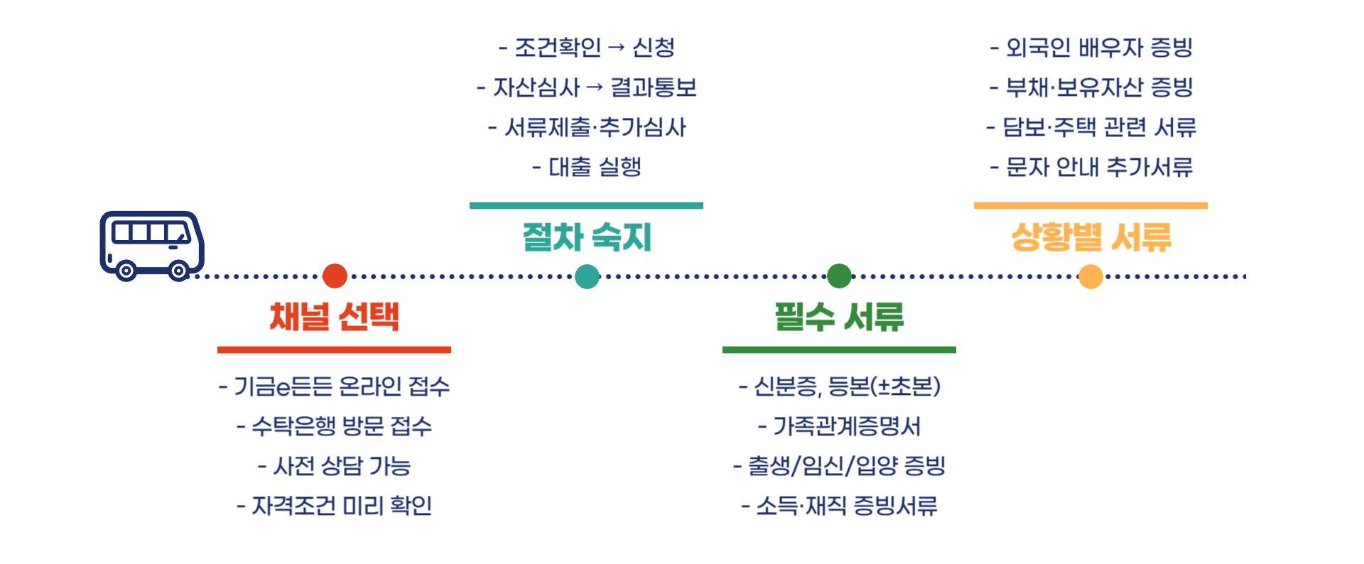 기금포털 또는 은행 상담을 통해 대출 기본요건·취급 가능 여부·예상 한도를 확인합니다.