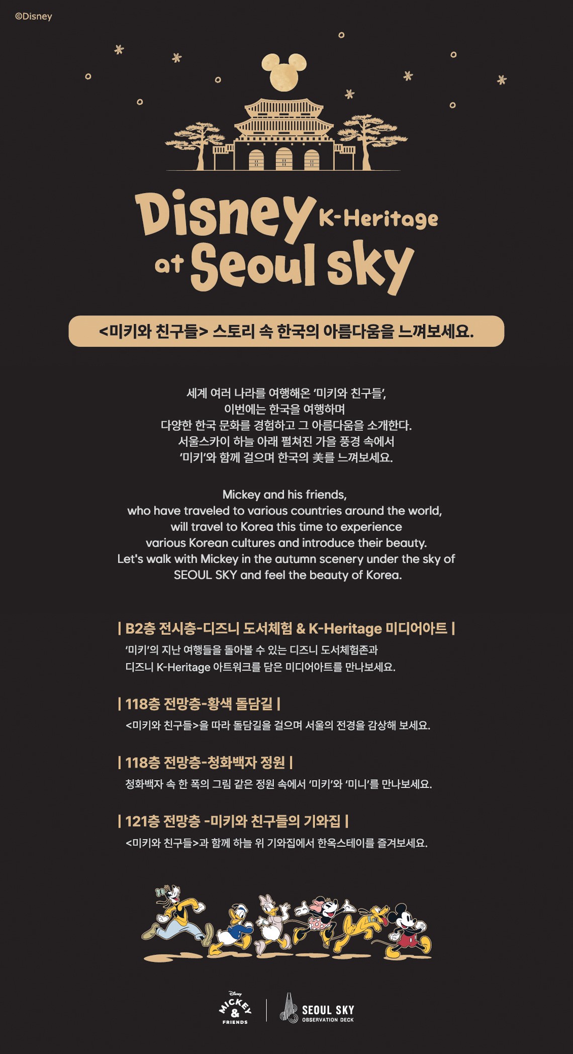 서울스카이 곳곳이 한국 전통문화와 디즈니 캐릭터가 어우러진 특별 전시 공간으로 꾸며집니다.