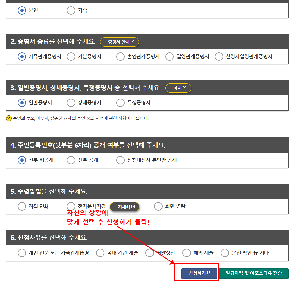 - “가족관계증명서” 또는 “혼인관계증명서” 클릭
