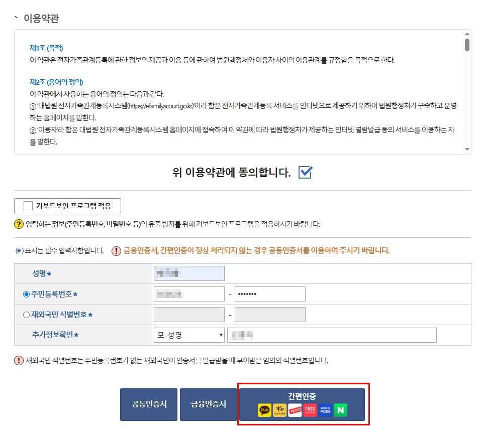 - 공동인증서 또는 간편인증(PASS 등) 로그인