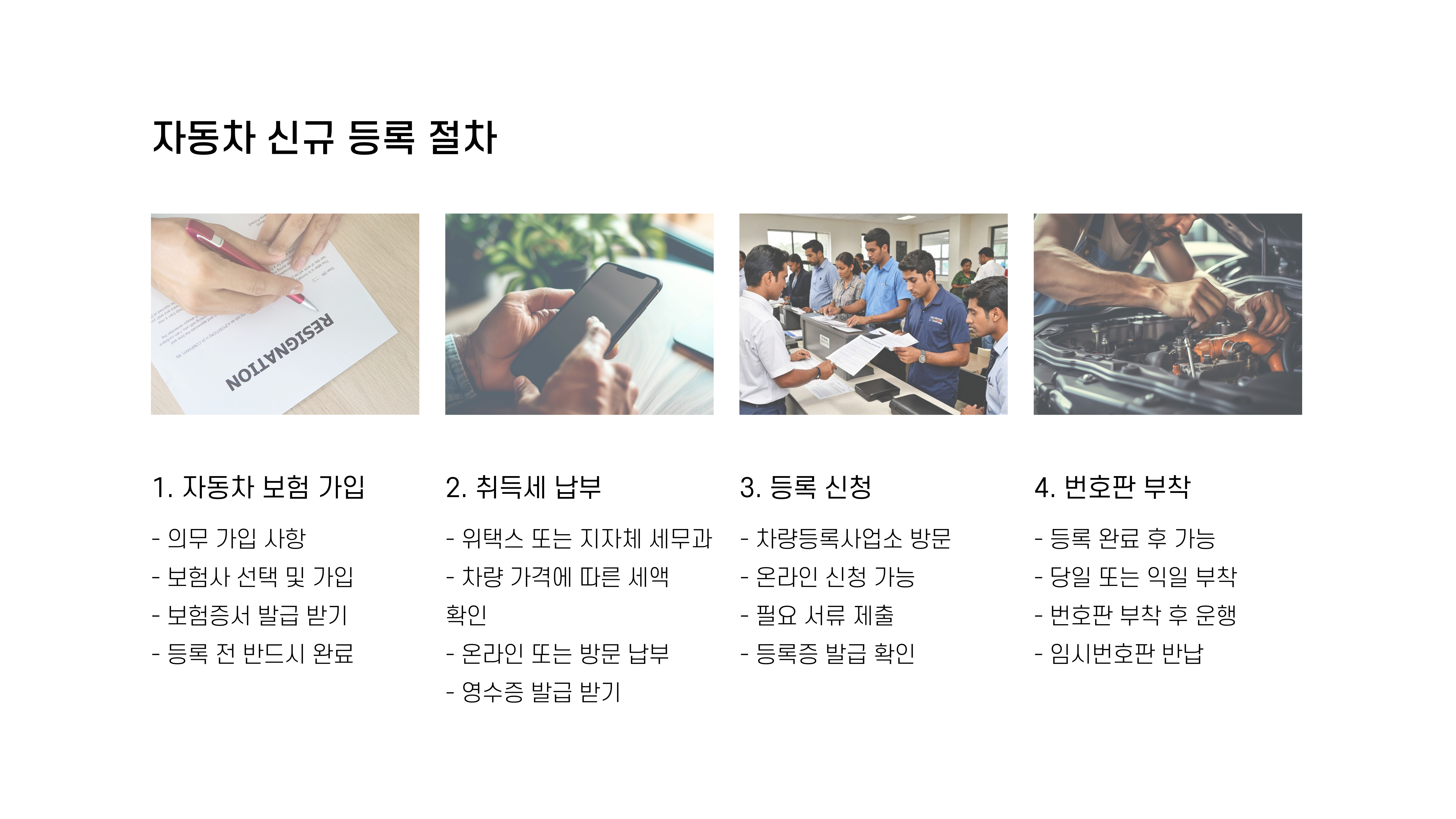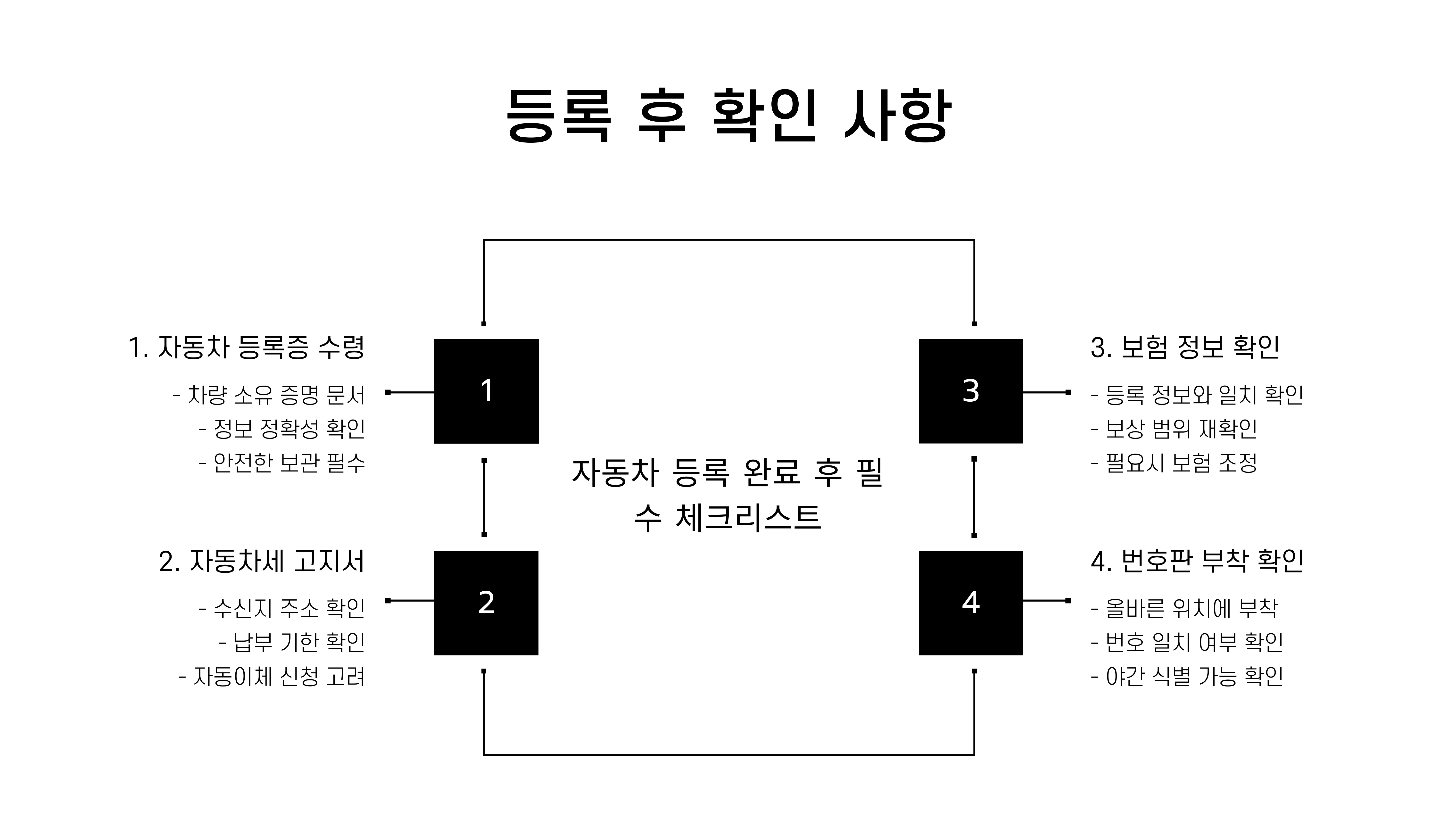 등록을 마쳐야 번호판이 발급되고, 보험 가입 및 세금 납부가 가능해집니다.