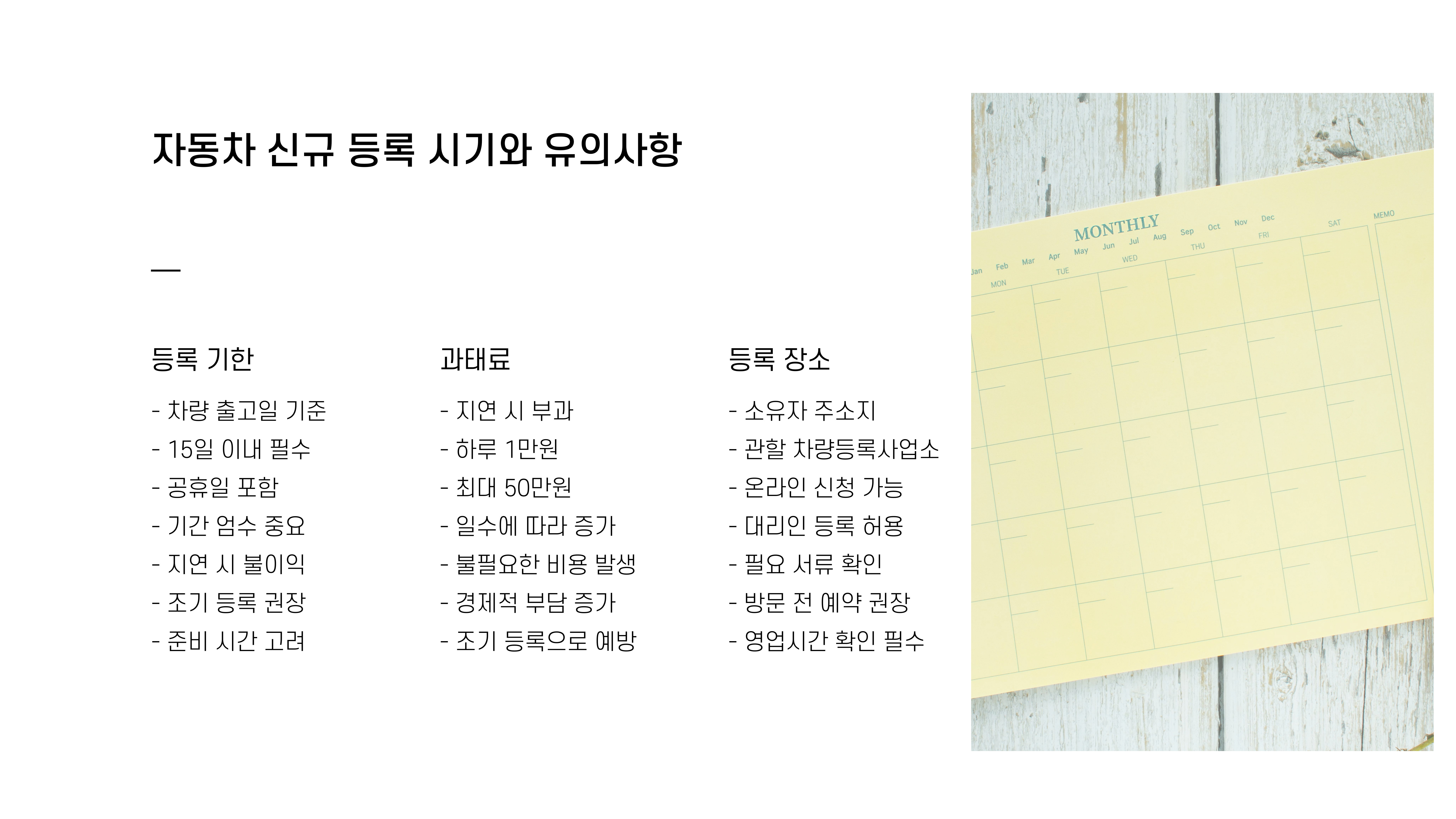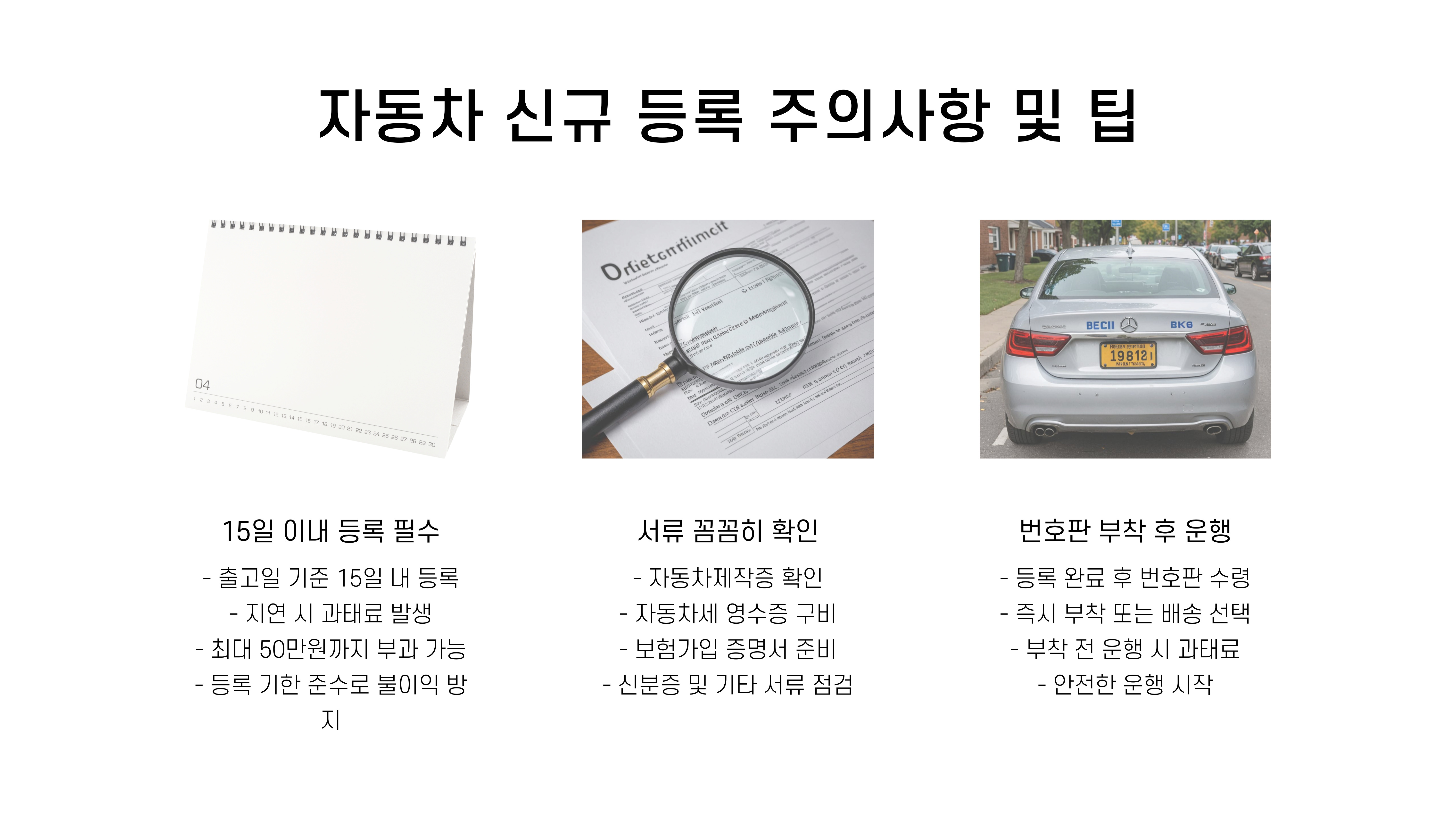 - 등록 기한: 차량 출고일 기준 15일 이내 필수 등록