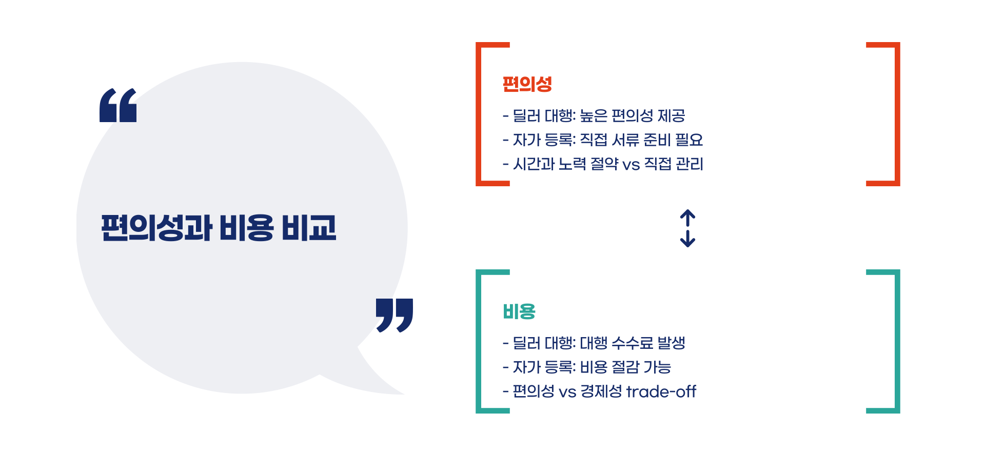 - 인감증명서, 보험증명서, 취득세 납부 등 모든 서류를 직접 준비 및 제출해야 함