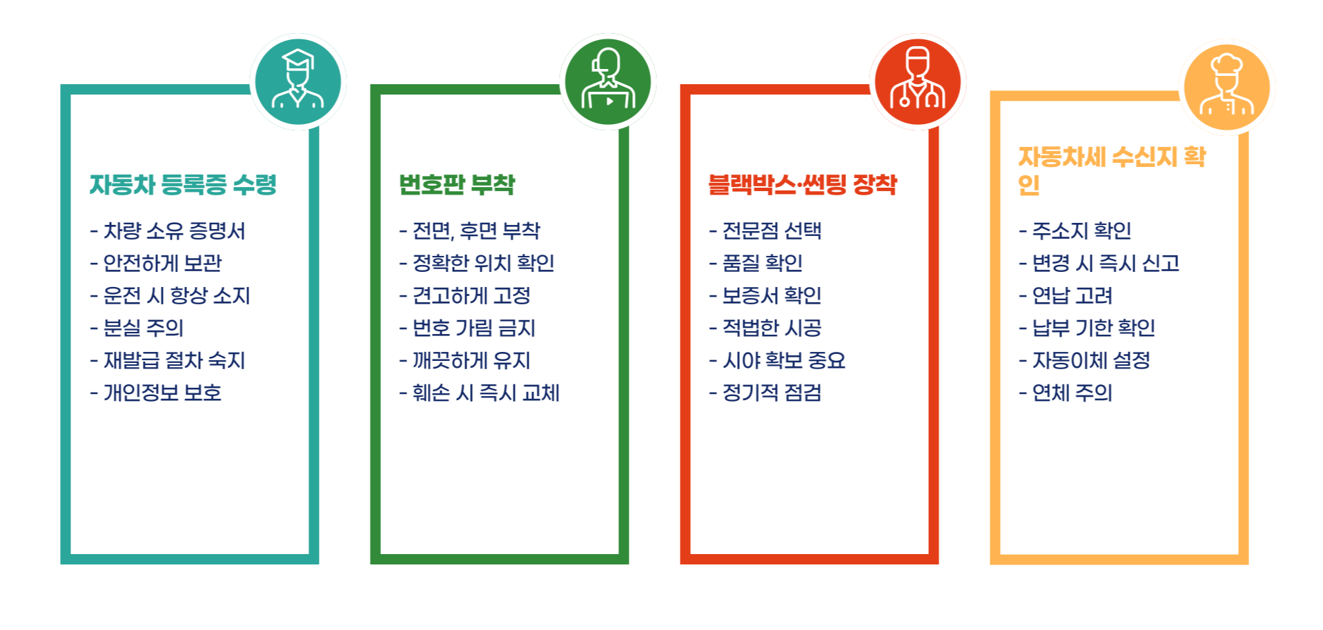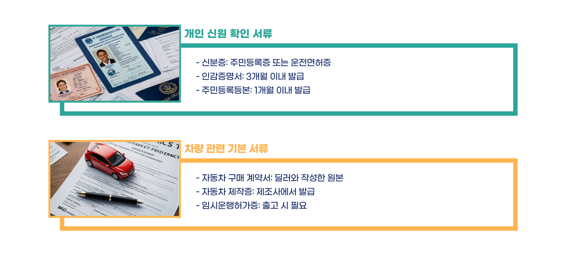 특히 차량 등록, 보험 가입, 번호판 부착 등은 준비 서류가 미비할 경우 일정 지연으로 이어질 수 있어요.