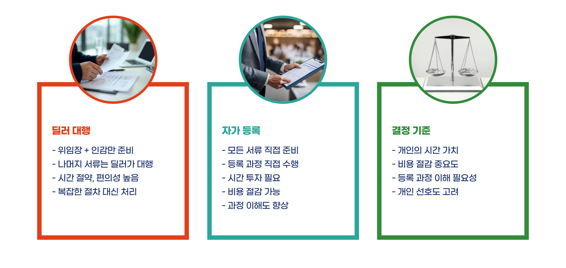 이번 글에서는 신차 구입 시 필요한 기본 서류부터 딜러 대행과 자가 등록 시 차이,