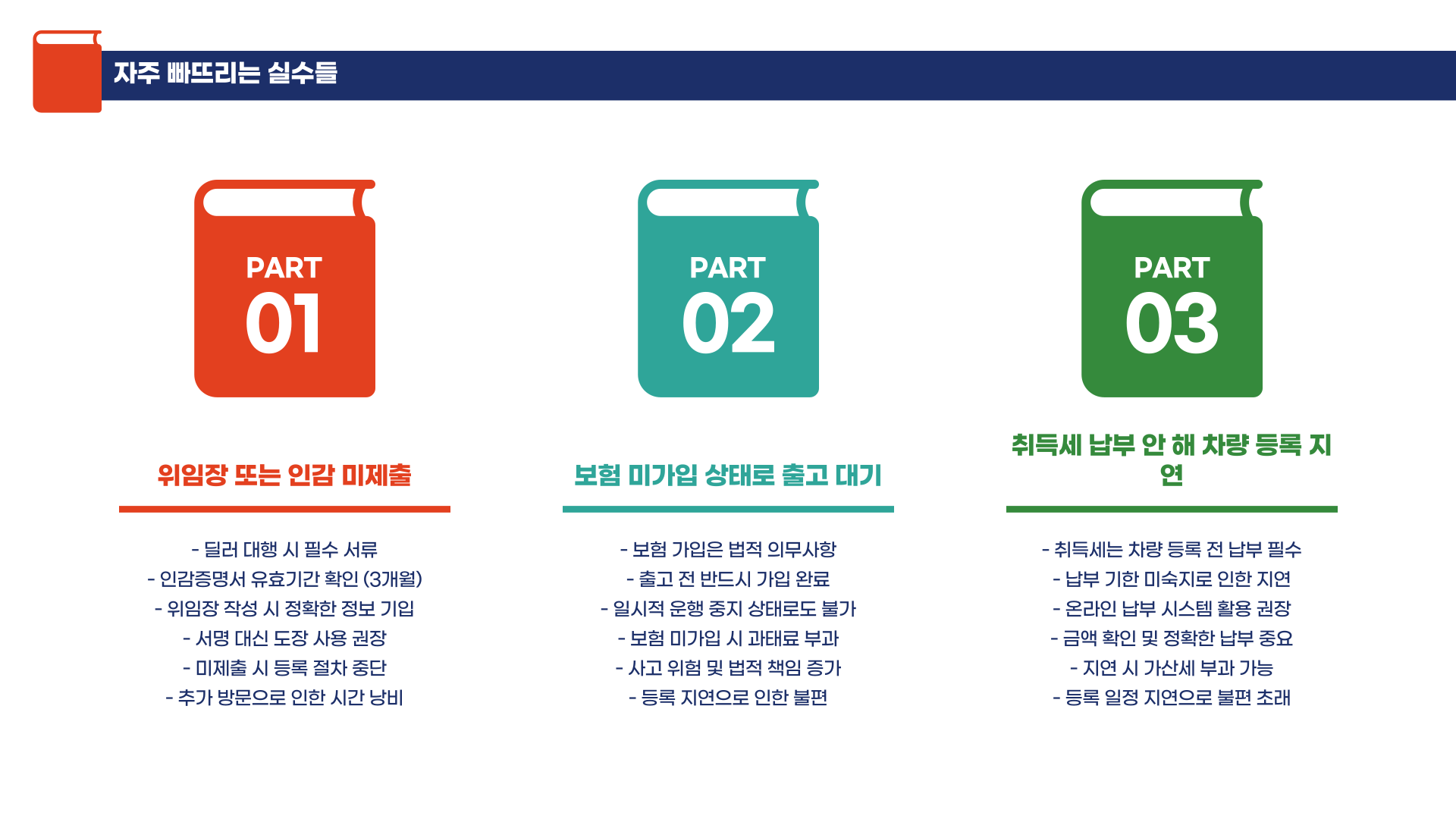 특히 차량 등록, 보험 가입, 번호판 부착 등은 준비 서류가 미비할 경우 일정 지연으로 이어질 수 있어요.