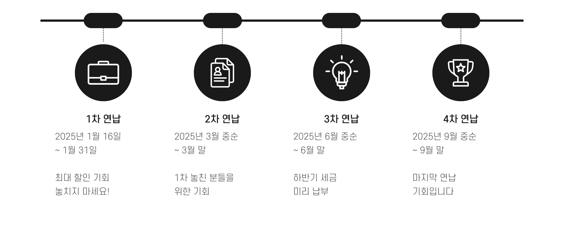 2025년에도 아래와 같이 연 4회 연납 신청 기회가 있으며, 1월 신청 시 가장 많은 할인율을 적용받습니다.