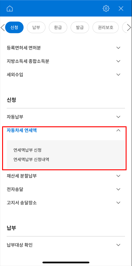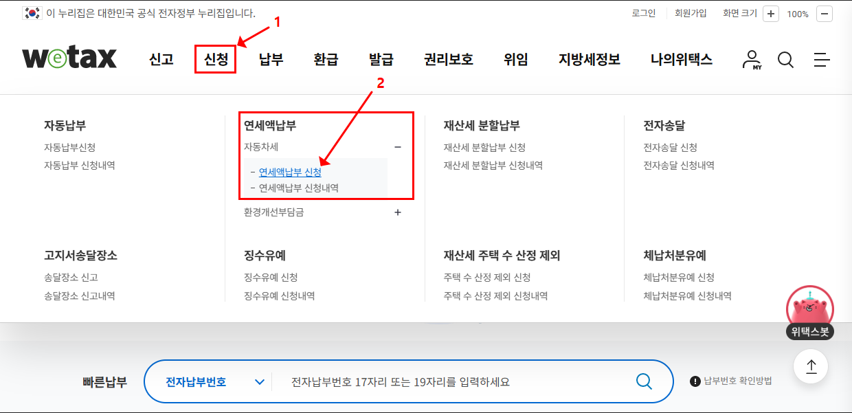 ▶ 본인 인증 후 메뉴 - 신청 - 자동차세 연세액 - 연세액납부 신청