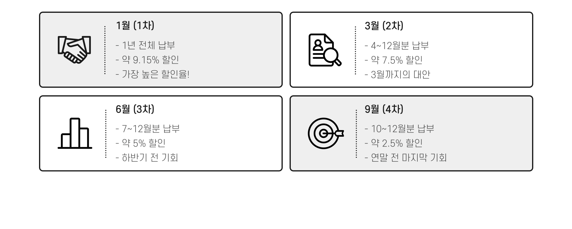 | 1월 (1차) | 1년 전체 | 약 9.15% | 가장 높은 할인율! |