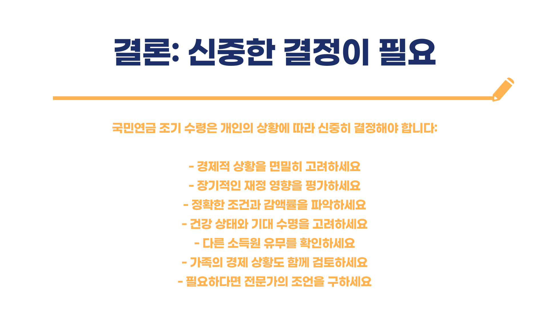 단기적으로는 생활에 도움이 되지만, 장기적으로는 총 수령액이 줄어드는 구조이므로 가능하다면 정해진 나이까지 기다리는 것이 더 유리할 수 있습니다. 하지만 사정이 어렵다면, 정확히 조건을 파악하고 제때 신청하는 것이 중요합니다.