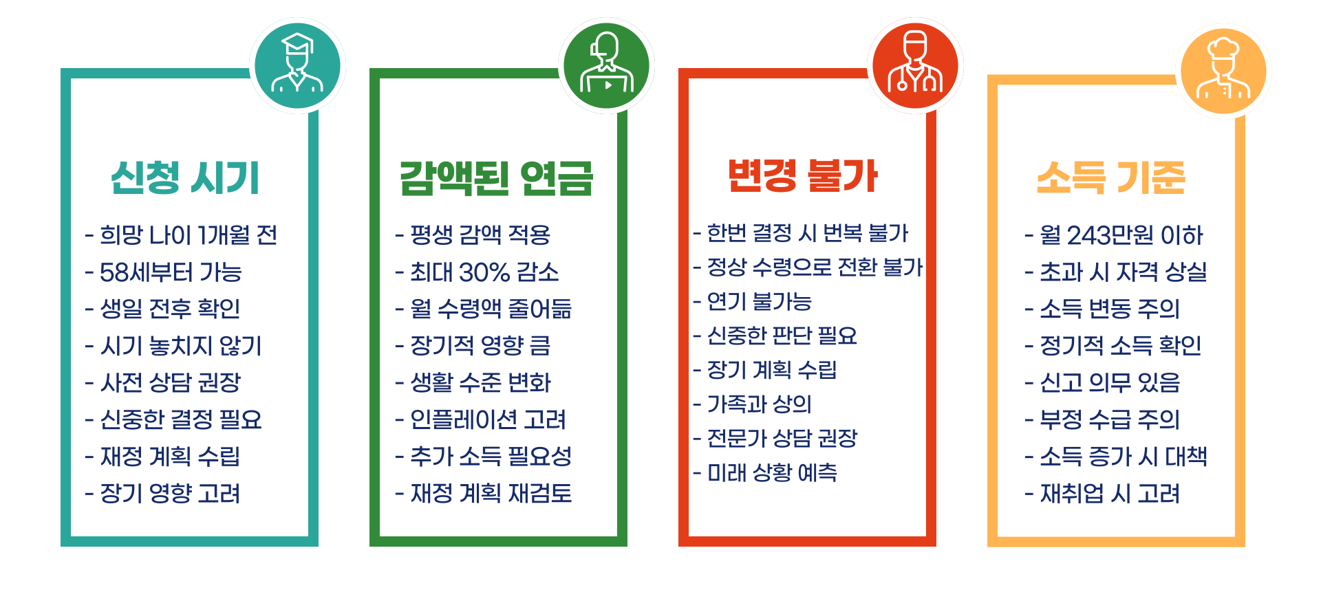 조기 수령은 수령액이 평생 감액된다는 중요한 조건이 있습니다.