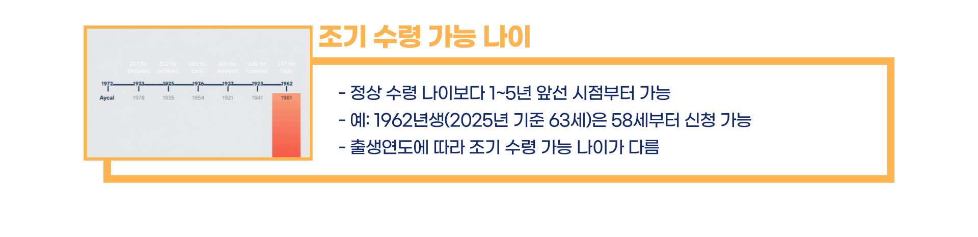 - 본인의 수령 기준 나이보다 1~5년 빠른 시점에 신청 가능