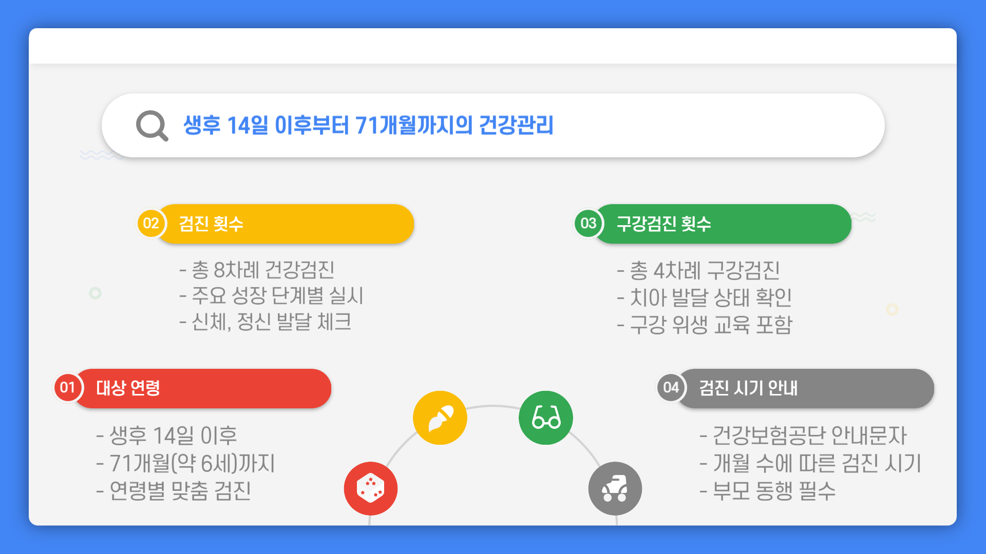 생후 14일 이후부터 총 8차례의 건강검진과 4차례의 구강검진이 제공됩니다.
