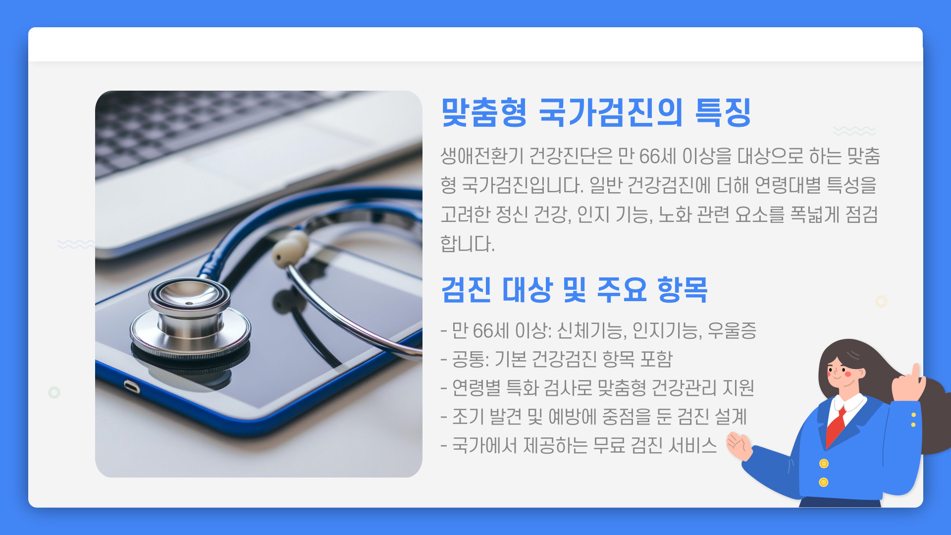 💡 일반 건강검진에 더해 연령대에 따라 정신 건강, 인지 기능, 노화 관련 요소까지 폭넓게 점검합니다.
