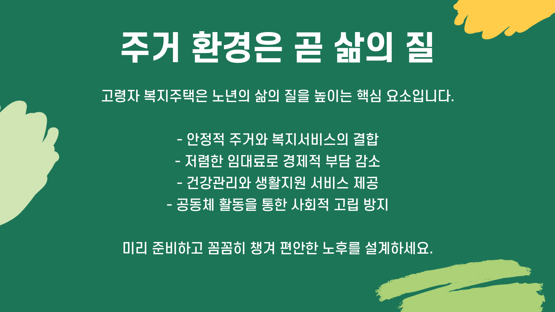 주거의 안정 + 복지서비스의 결합을 통해 노년기를 건강하고 존엄하게 보낼 수 있는 기반입니다. 안정적인 주거와 촘촘한 복지 서비스가 결합된 고령자 복지주택은 우리 부모님과 나의 행복한 노후를 위한 가장 현실적이고 든든한 선택지가 될 수 있습니다. 오늘 알려드린 정보를 바탕으로 미리 준비하고 꼼꼼히 챙겨서, 활기차고 편안한 노년의 보금자리를 마련하시길 바랍니다.