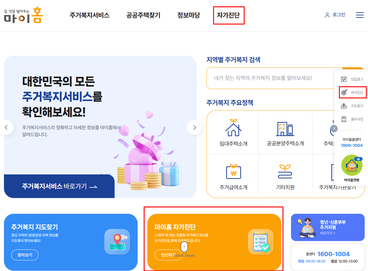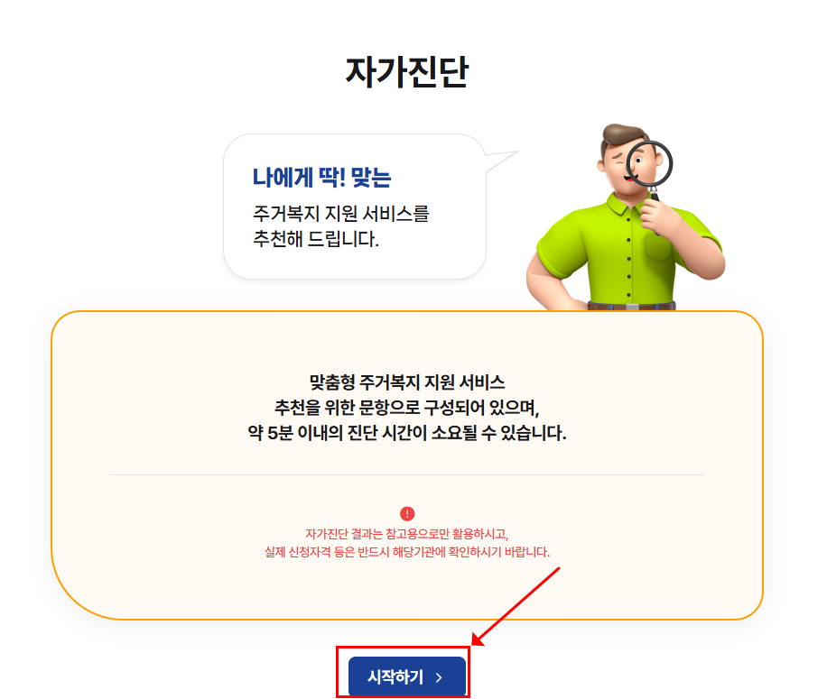 👉 마이홈 포털 https://www.myhome.go.kr/hws/portal/main/getMgtMainPage.do 접속 → 자가진단 메뉴 (3개 중 아무거나 선택) → 자가진단 '시작하기’ 클릭