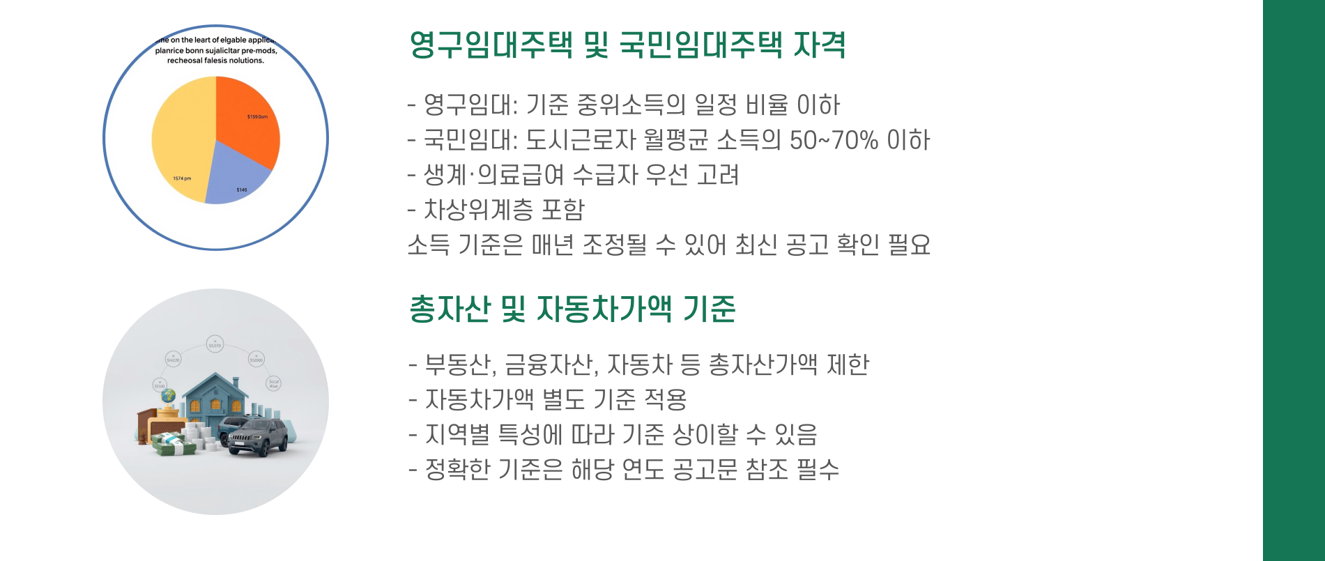 - 영구임대주택 자격: 생계·의료급여 수급자, 국가유공자 등 소득 인정액이 기준 중위소득의 일정 비율 이하인 경우