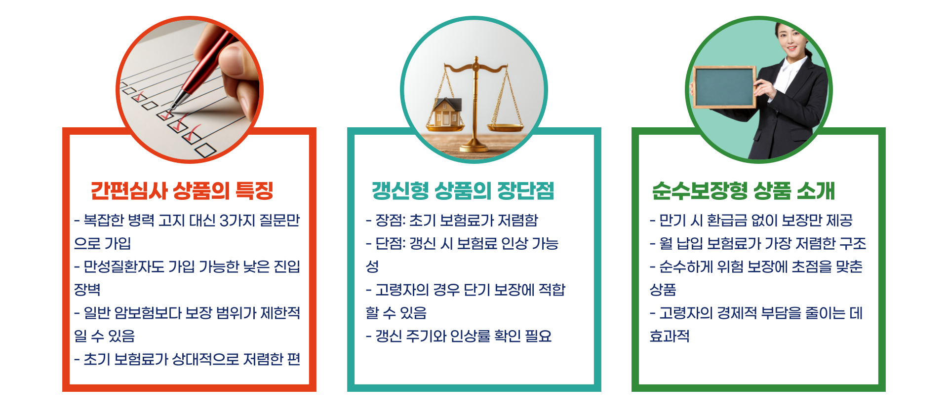 - 갱신형 상품: 초기 보험료가 저렴한 대신, 10년 등 일정 주기마다 보험료가 갱신(인상)될 수 있습니다. 고령자의 경우, 저렴한 초기 비용으로 보장을 시작할 수 있어 합리적일 수 있습니다.