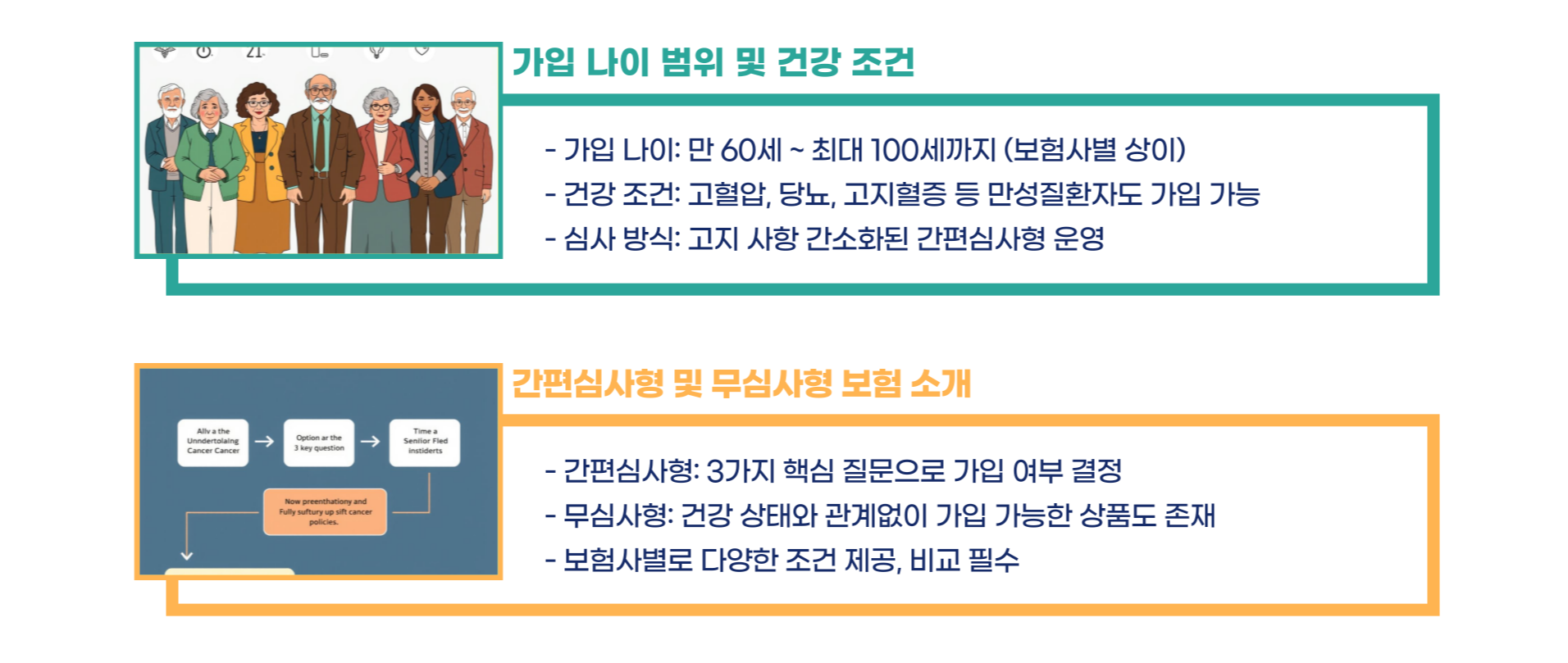 - 가입 나이: 만 60세 ~ 최대 100세까지 (보험사별 상이)