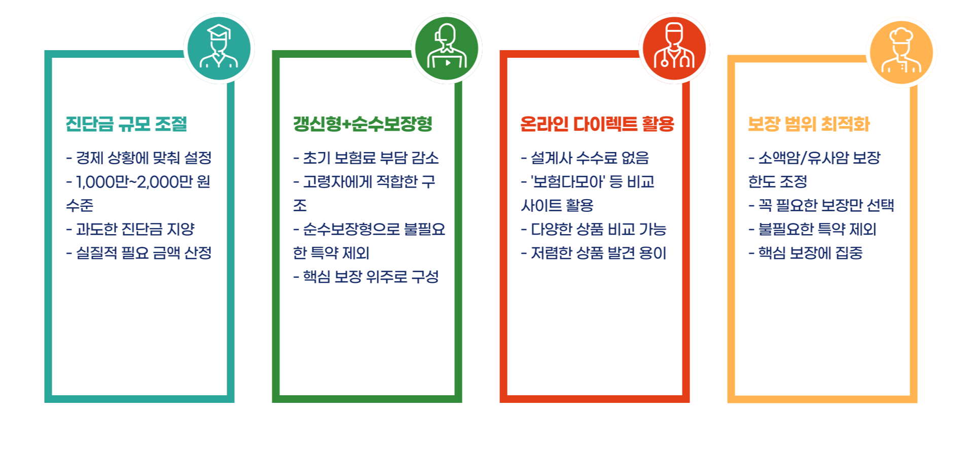 - 온라인 다이렉트 보험 활용: 설계사 수수료가 없는 온라인 다이렉트 상품이나 '보험다모아' 같은 비교 사이트를 활용하면 더 저렴한 상품을 찾을 수 있습니다.