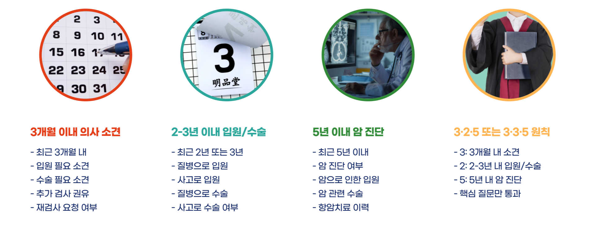 간편심사형 3가지 핵심 질문: 복잡한 병력 고지 대신, 아래 3가지 핵심 질문에만 해당하지 않으면 가입할 수 있는 경우가 많습니다. 이를 흔히 '3·2·5' 또는 '3·3·5' 원칙이라고 부릅니다.